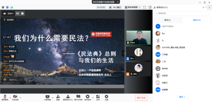 第一期普法讲堂中,卢佳俊律师从执业近十年所接触的上千例真实案件中撷取一二,为同学们娓娓道来生活中的那些民法知识。原计划一个半小时的讲座,在同学们兴致勃勃的无数提问和讨论中被延长至两个半小时。