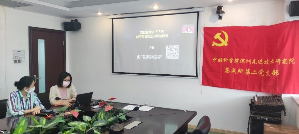 会议首先邀请数字所尹凌老师作题为《数据智能支持下的城市疫情时空分析与建模》科研抗疫工作报告。数月来,为了打赢新冠肺炎疫情防控阻击战,尹凌老师和团队开展了基于大数据的新冠肺炎传播分析、疫情发展预测建模与防控措施效果研究,持续为政府决策提供专业的意见及建议,为疫情防控贡献自己的智慧与力量。参会党员倍受鼓舞,纷纷表示作为科研工作者要学习尹凌老师科研抗疫、努力工作的精神,以所学回报社会。
