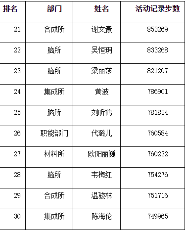 健步总里程中,健步总步数在SIAT总排行榜前10名的,颁发健步总里程奖金奖奖牌一枚,奖励科苑群团云工会300元提货券;健步总步数在SIAT总排行榜第11-20名的,颁发健步总里程奖银奖奖牌一枚,奖励科苑群团云工会200元提货券;健步总步数在SIAT总排行榜第21-30名,颁发健步总里程奖铜奖奖牌一枚,奖励科苑群团云工会100元提货券;具体名单如下: