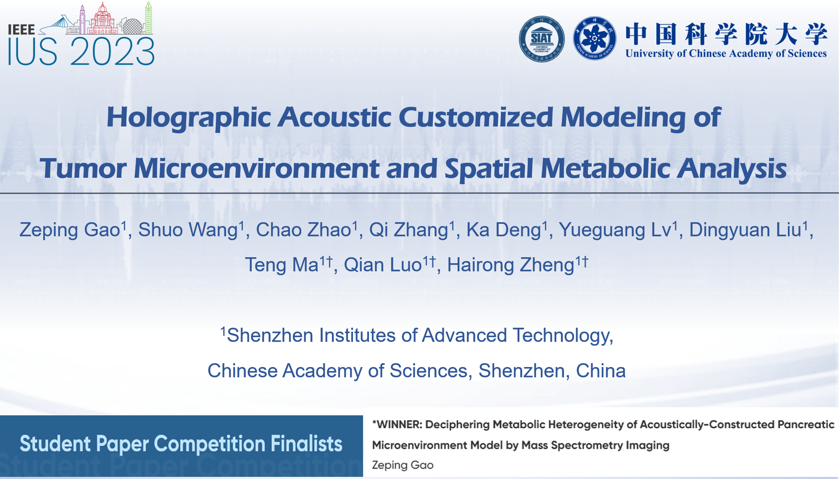 获奖论文以Deciphering Metabolic Heterogeneity of Acoustically-Constructed Pancreatic Cancer Microenvironment Model by Mass Spectrometry Imaging(胰腺癌微环境模型的全息声学构建与代谢异质性解读)为题,由深圳先进超声团队以及质谱成像团队共同完成,深圳先进院国科大硕士生高泽平为论文和本研究的主要作者以及汇报人。