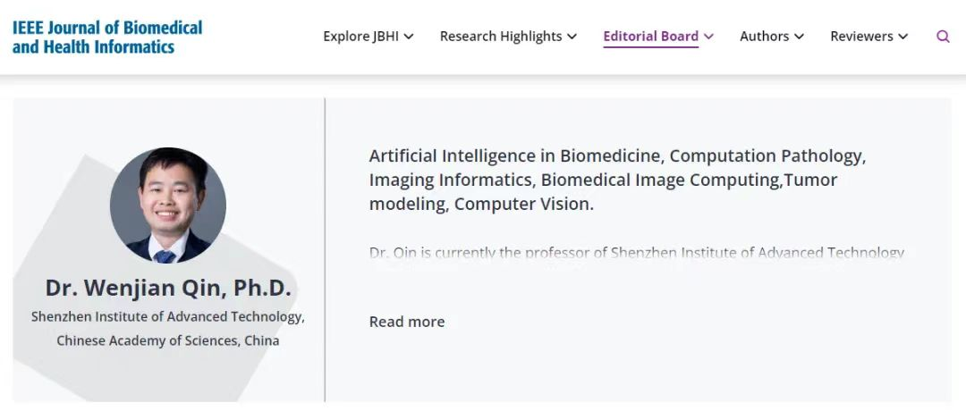 近日,中国科学院深圳先进技术研究院医工所秦文健研究员收到SCI学术期刊IEEE Journal of Biomedical and Health Informatics(J-BHI)编委正式邀请,担任该期刊副编委(Associate Editor)。