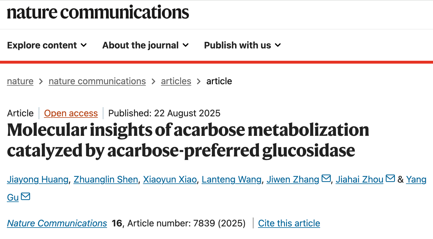 阿卡波糖是治疗2型糖尿病的一线药物,但其疗效常被肠道细菌中的“阿卡波糖杀手”——阿卡波糖糖苷水解酶(Apg)破坏。近日,中国科学院深圳先进技术研究院合成生物学研究所客座研究员/南京师范大学教授周佳海团队及其团队副研究员古阳,联合西北农林科技大学教授张继文团队等,在Nature Communications发表题为“Molecular insights of acarbose metabolization catalyzed by acarbose-preferred glucosidase”的最新研究成果,利用X射线晶体学、计算模拟和生化实验结合,深入解析了Apg水解阿卡波糖的精细分子机制(图1),为设计新一代抗降解、更高效的降糖药物提供了关键的结构蓝图。