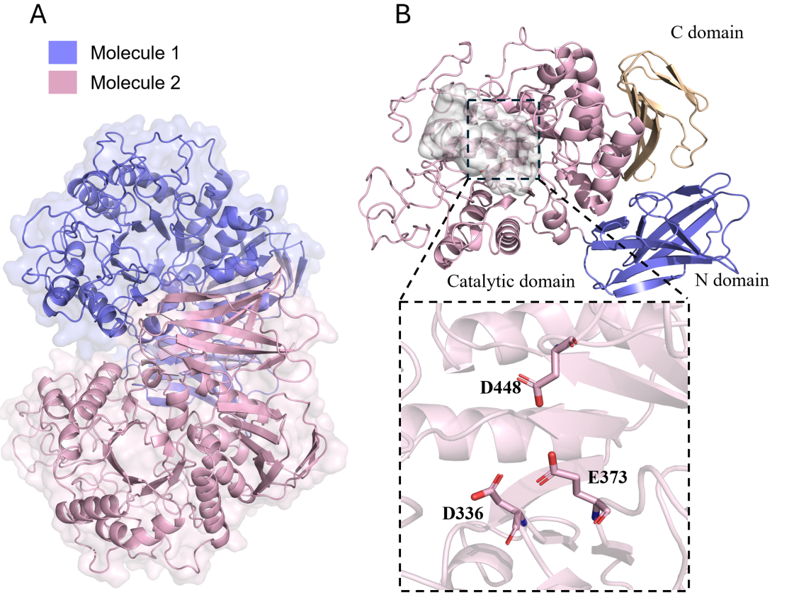 Apg属于糖苷水解酶家族13_21 (GH13_21),通常负责水解α-1,4-O-糖苷键。但其独特之处在于能有效水解结构复杂的阿卡波糖。研究解析了Apg的高分辨率晶体结构(图3):(1)Apg在溶液中以同源二聚体形式存在,单体间通过N端结构域和催化结构域呈头尾排列。(2)催化结构域采用经典的TIM桶折叠,活性位点是位于TIM桶顶部的一个突出表面凹槽,凹槽底部有一个绝对保守的催化三联体(Asp-Glu-Asp)。(3)与其他淀粉酶(如MaIZ, MaIS)相比,Apg的活性口袋裂隙更窄(7.9 Å),能紧密结合阿卡波糖,计算也显示其对阿卡波糖的结合亲和力更高。(4)结合生化实验、晶体结构和计算分析,发现两个关键的柔性环(loop A和loop B)不仅影响底物结合还决定其催化能力。