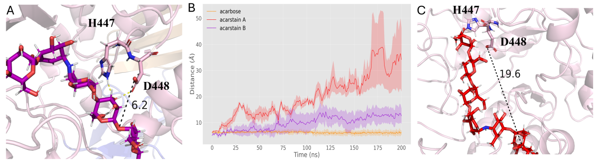 研究还利用解析的Apg结构,对已知对Apg具有抗性的阿卡波糖类似物——acarstatins A和acarstatins B进行了计算分析。分子动力学模拟显示,它们也能结合在Apg活性腔内。但关键差异在于,它们分子中水解位点C1原子与亲核试剂D448 OD2的距离比阿卡波糖中的距离更远,使得D448难以有效攻击其糖苷键。进一步的QM/MM计算证实,水解acarstatinsA/B的活化能垒高于阿卡波糖。这为设计抗Apg降解的新药提供了直接线索:通过修饰改变底物关键原子与催化残基(特别是D448)的空间距离或相互作用。