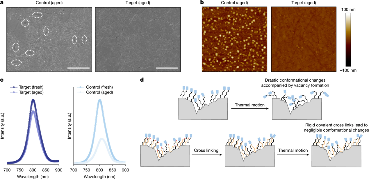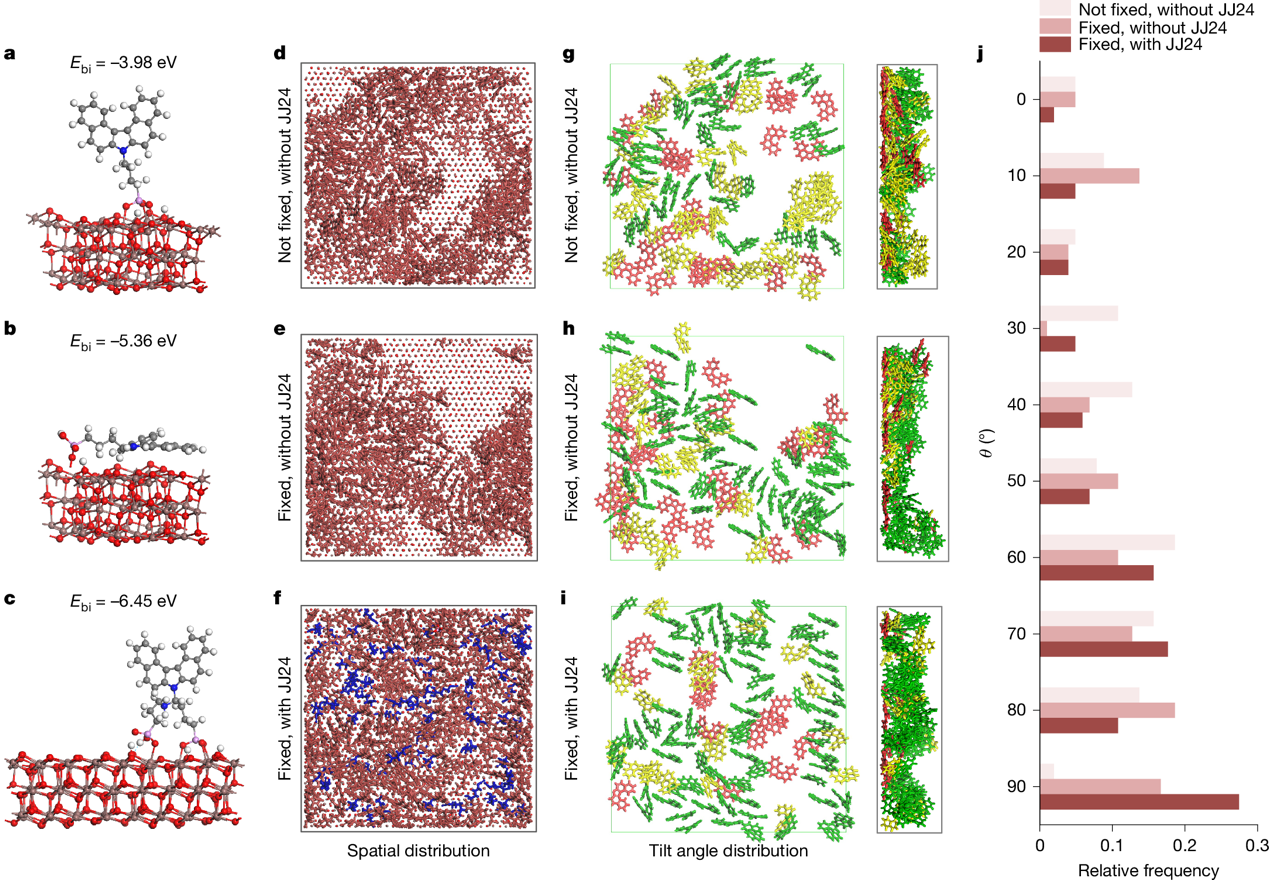 该研究中,研究团队设计引入了一种优化了碳链长度的含叠氮基团新型SAM分子JJ24,能够增强主体SAM分子CbzNaph在透明导电氧化物衬底表面的分布均一性,并抑制自组装过程中缺陷和空隙的形成。JJ24分子的含叠氮基团可以通过热激活方式,与CbzNaph分子的烷基链原位共价交联,构成紧密组装的co-SAM层(图1)。这一结构显著增强了CbzNaph的择优取向性(图2),并通过强化CbzNaph分子烷基链连接体刚性,抑制在光照和热应力下因分子摆动而引起的透明导电氧化物衬底表面暴露,防止了钙钛矿层埋底界面分解,并抑制器件界面处的非辐射复合损失(图3)。