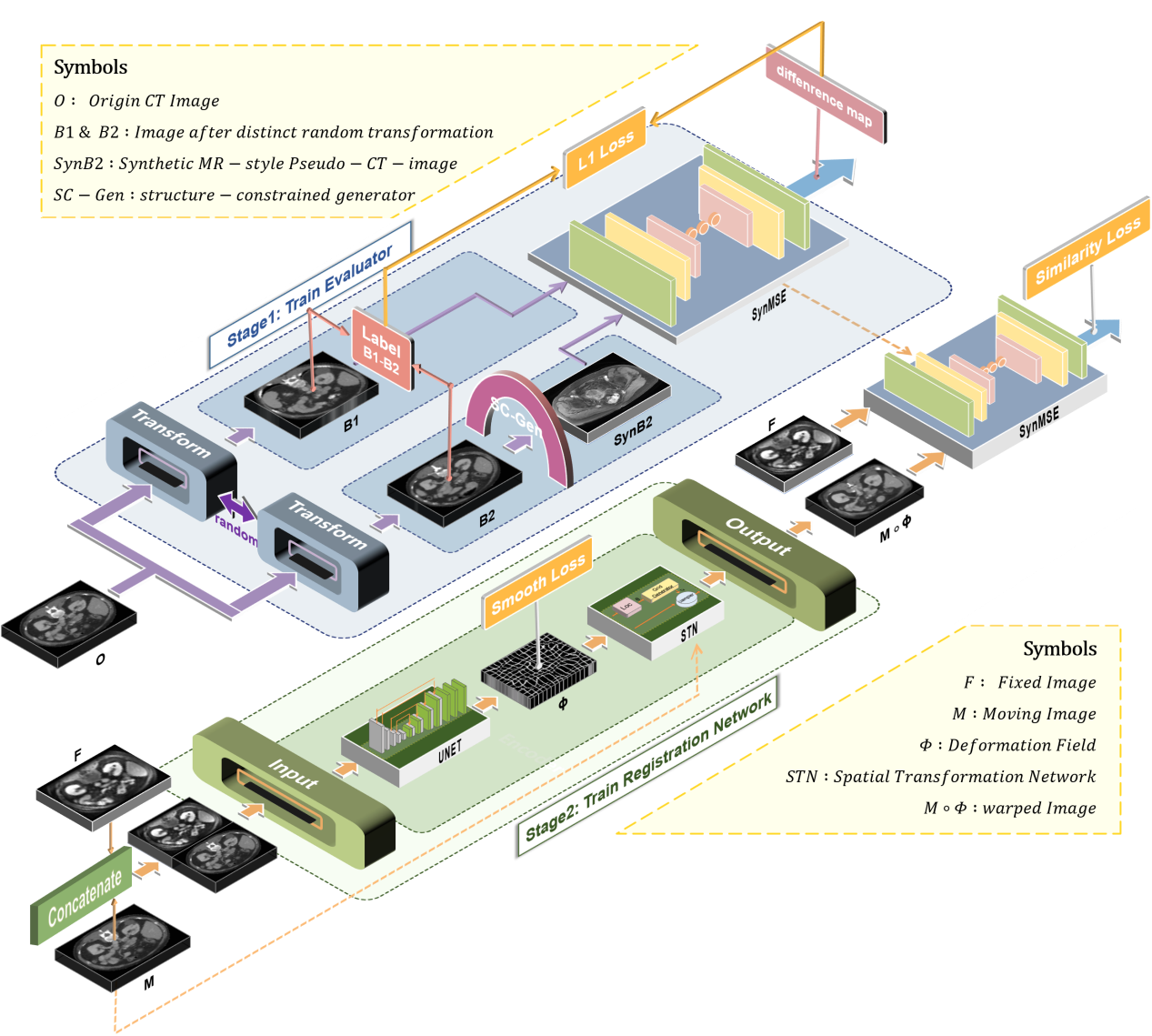 研究团队提出了一种全新的解耦空间与分布信息的无监督配准框架。具体而言,团队设计了一个基于 Structure-Constrained CycleGAN 的生成器,用于模拟模态间的灰度差异并保持解剖拓扑一致性;同时,通过随机变换与伪影像生成分离空间错位与分布差异,使 SynMSE 评估器能够忽略模态特有的灰度差异,聚焦于空间对齐,从而作为即插即用的相似性度量模块无缝集成于任意配准网络中。