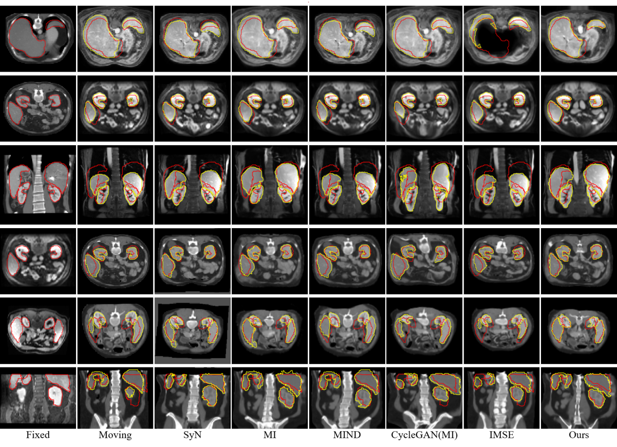 研究结果表明,SynMSE 在L2R 2022 CT-MR腹部数据集、临床宫颈CT-MR数据集以及CuRIOUS MR-US脑数据集上均取得了最优配准性能。与传统方法相比,SynMSE显著提升了Dice系数、降低了HD95与TRE误差,实现了在复杂模态差异下的高精度解剖结构对齐。图4-图6分别为所提出方法在三个数据集上的定性结果展示,红色标注代表固定图像的目标器官区域,黄色标注代表浮动图像与配准后图像的目标器官区域。表示图中结果显示,SynMSE更好的克服了多模态图像间的复杂分布差异,不仅实现了更精确的配准效果,而且有效保持了组织边界与解剖拓扑的完整性,明显优于现有方法。