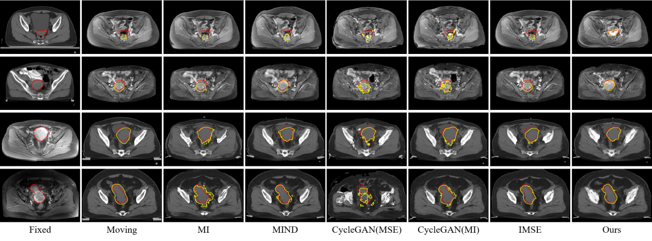 图5:所提出方法与现有方法在临床宫颈CT-MR数据集上的定性效果