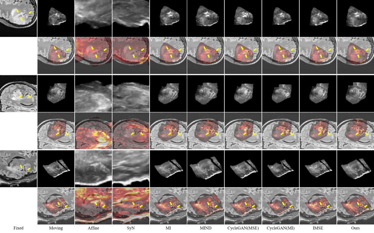 图6:所提出方法与现有方法在CuRIOUS MR-US脑数据集上的定性效果(黄色箭头指向图像上的较为明显的脑沟等显著结构)