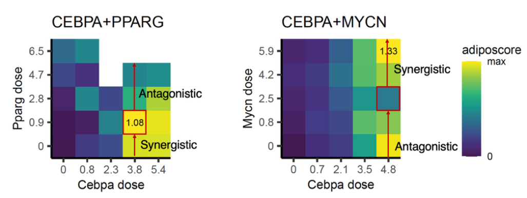 在组合扰动实验中,研究者发现不同转录因子的相互作用不仅取决于基因组合本身,还强烈依赖于基因剂量。同一对转录因子组合在不同剂量下可表现为可逆转的协同或拮抗作用,且这种效应具有基因特异性,进一步凸显了基因网络调控的复杂性。