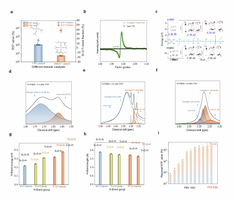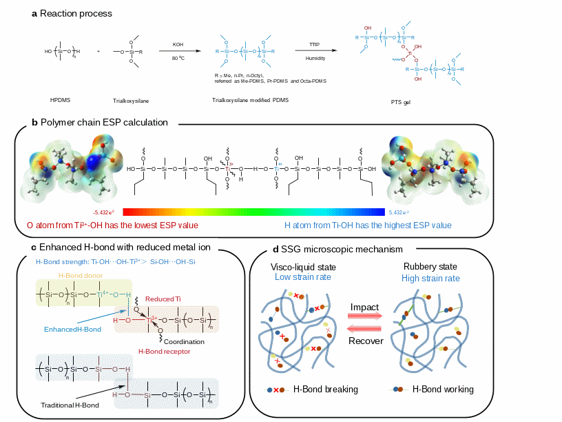 针对上述问题,何睿团队开发出新型聚钛硅氧烷体系(PTS),首次提出基于金属离子介导的氢键增强策略调控超分子网络中的氢键强度,来替代传统PBS体系中的B-O动态键。与PTS中的Si-OH相比,体系中Ti3⁺-OH的O原子电荷密度更高,而Ti4⁺-OH的H原子电荷密度更低,因此作为氢键供体和受体能产生更强的氢键相互作用(图1)。当承受高频剪切应力时,氢键形成的动态可逆网络难以断裂,无序的高分子链无法松弛和解缠,高分子链运动受限在宏观尺度上呈现出高刚性状态。本工作开发的新型PTS SSG克服了传统PBS体系的腐蚀性和毒性问题,同时提出的金属离子介导的氢键增强策略为其他超分子功能材料构建提供了新路径。