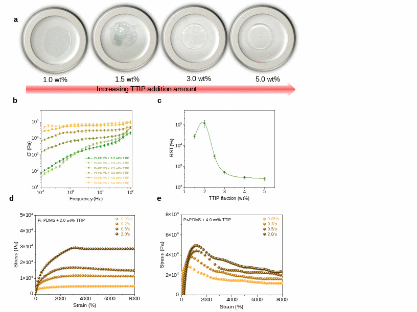 传统的剪切硬化胶(SSG)通常为聚硼硅氧烷体系(PBS),它是通过硼酸(BA)在高温下交联聚二甲基硅氧烷(PDMS)制备而成。硼酸不仅对钢铁和混凝土具有腐蚀性,而且在高温下腐蚀速率加剧,更有多项动物实验证明长期接触硼酸可能导致中毒反应。这些安全隐患严重限制了SSG在诸多领域的应用,因此开发新一代无硼SSG迫在眉睫。