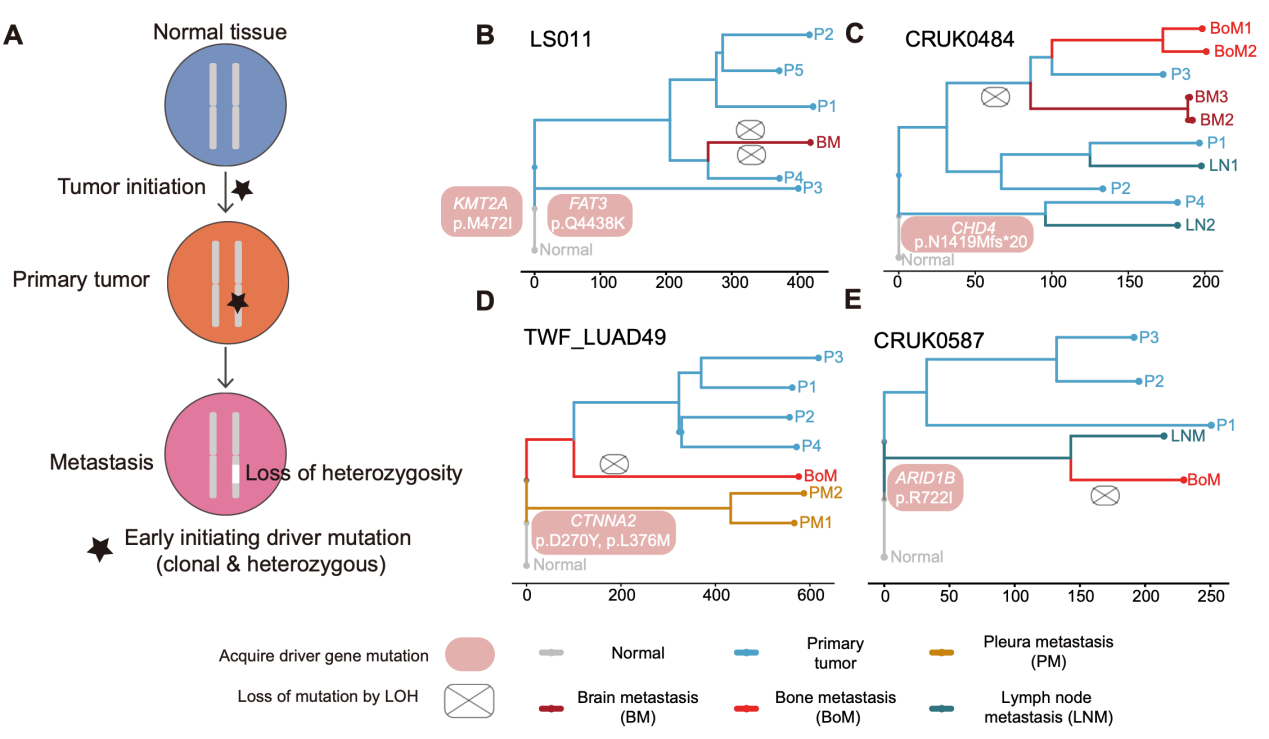 转移是导致90%以上癌症病人治疗失败和死亡的原因。其中非小细胞肺癌(NSCLC)患者中约1/3会发生脑转移。与其他转移部位不同,脑转移需跨越血脑屏障,既影响肿瘤细胞的适应性,也限制治疗方案的选择。既往关于转移的基因组学研究,主要基于非配对原发和转移的肿瘤突变图谱比较。然而,这种研究策略难以鉴定原发灶中驱动转移的突变基因,同时难以解析转移的演化规律和适应性。因此,系统分析和比较同一病人的原发灶和多器官转移灶的基因组学,阐明转移器官趋向性的基因组学特征与演化规律,具有重要意义。