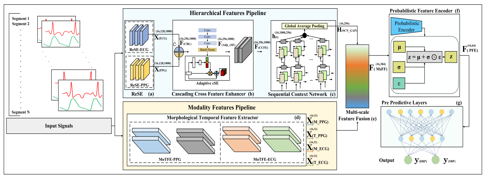 血压是反映心血管功能和血管阻力的关键生理参数,也是评估整体心血管疾病风险的核心指标。它与代谢健康状况密切相关,是代谢综合征的诊断标准之一。在针对高血压或代谢综合征患者进行营养干预时,血压的动态监测是评估干预效果和进行个体化饮食调整的重要依据。无袖带血压监测技术具有连续、非侵入性等优点,为实现血压的动态监测提供了新手段,其临床与公共卫生意义日益凸显。然而,现有技术仍受限于信号处理复杂、特征表达不足以及准确度较低等关键瓶颈,致使其在真实场景中的规模化应用仍面临严峻挑战。