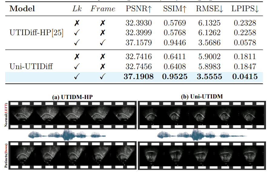 实验结果表明,Uni-UTIDiff 不仅在统一框架下能够分别达到针对健康与病理语音的专家模型性能水平,还能在生成的舌超声图像中展现出优异的清晰度与自然度,充分验证了其在跨发音模式下的鲁棒生成能力。