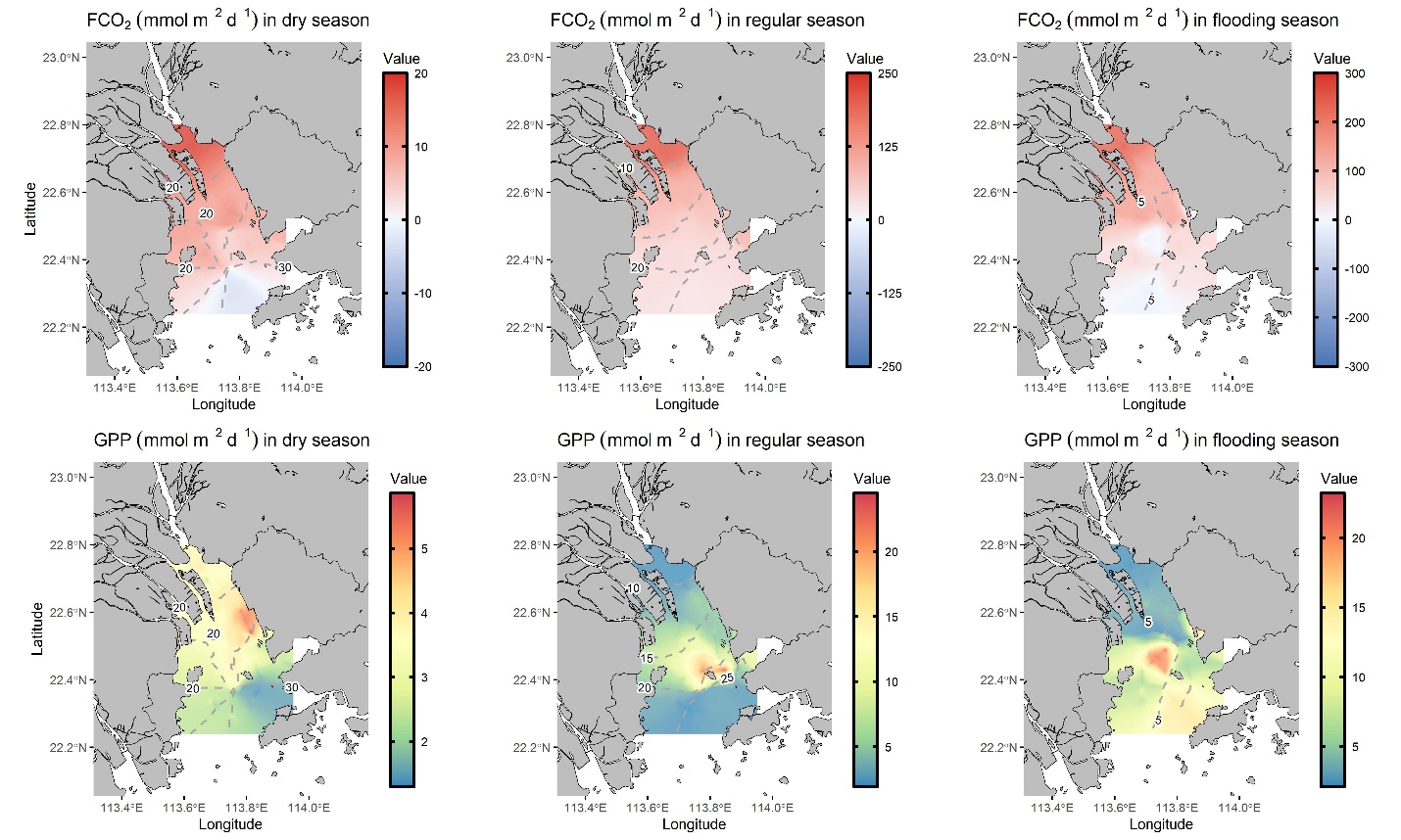 研究发现该区域并非单一的碳源或碳汇,而是一个由河流与海洋共同塑造的“空间划分的碳处理器”,上游(河流影响区)为强CO₂ 释放源,洪泛期通量峰值高达291.6 mmol C·m⁻²·d⁻¹;下游(海洋影响区)则转变为 CO₂ 吸收汇,净自养作用驱动通量降至-48.6 mmol C·m⁻²·d⁻¹;这一“源—汇”转变主要发生在距河口约40公里的空间阈值处,反映出水文混合与营养盐利用效率的综合调控作用。此外,研究揭示出大湾区蓝碳系统存在显著的季节性脉冲效应——洪汛期的碳通量远高于旱季,陆源输入的增强成为调控碳释放的关键因素。 尽管浮游植物光合作用驱动碳吸收,但高达 40%–60% 的固定碳会因异养作用被重新释放回大气。这种“即产即消”的机制形成了一个“碳循环回路”,显著削弱了河口生态系统的净固碳效率,也意味着基于叶绿素或卫星数据的碳汇估算可能被系统性高估。