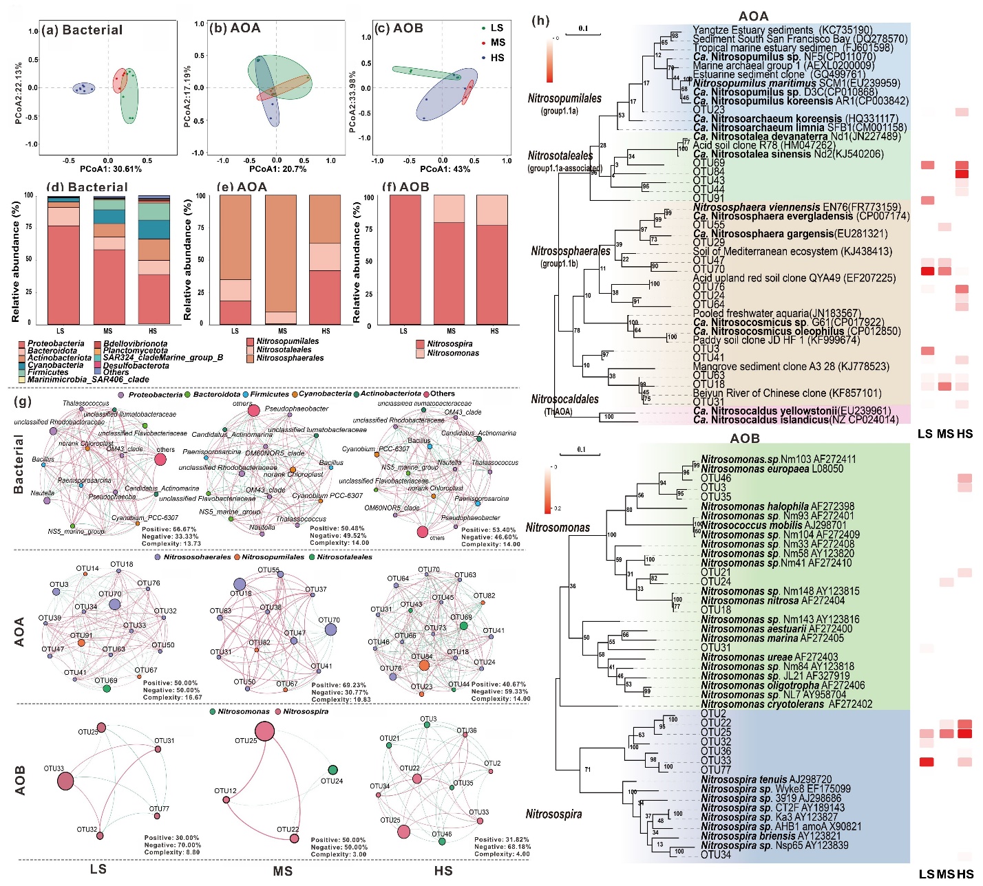 同时,研究进一步发现,长期富营养化状态下,珠江口水体酸化速率远高于开阔海域。在伶仃洋中游区域(即40公里的“源—汇”转换阈值处)形成了显著的“酸化–硝化”耦合热点。在该热点中,氨氧化微生物以铵盐为“燃料”进行硝化作用,每次反应都会释放出氢离子,削弱水体碱度并导致pH下降,形成局部“酸化中心”。该发现揭示了珠江口河口系统中存在一个自我强化反馈回路:富营养化驱动硝化作用,硝化引发酸化,而酸化环境又会筛选并塑造特定的微生物群落,反过来再次增强硝化过程。这一机制从微观层面揭示了大湾区水域固碳效率下降的根本原因,也为治理富营养化、提升区域碳汇潜力提供了新的科学思路。