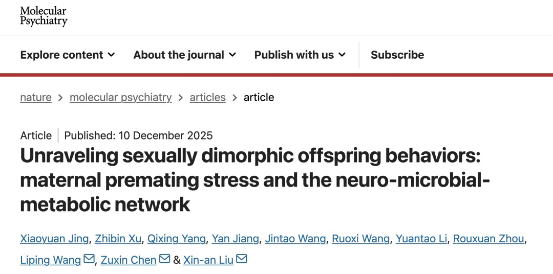 12月10日,中国科学院深圳先进技术研究院脑认知与脑疾病研究所/深港脑科学创新研究院刘欣安、陈祖昕和王立平团队,在Molecular Psychiatry发表题为"Unraveling Sexually Dimorphic Offspring Behaviors: Maternal Premating Stress and the Neuro-Microbial-Metabolic Network" 的研究论文。本研究系统解析了母代孕前压力—焦虑状态导致子代成年后情绪行为异常的脑体互作网络机制。