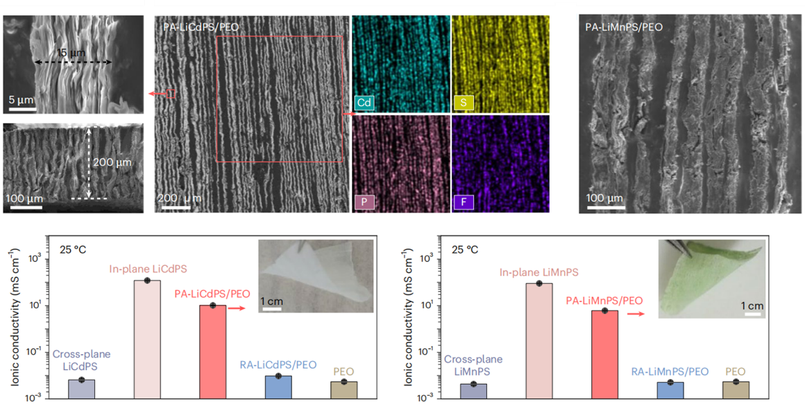 近日,中国科学院深圳先进技术研究院(以下简称“深圳先进院”)碳中和技术研究所成会明院士、彭晶副研究员联合华南理工大学胡仁宗教授,提出了一种新型复合固态电解质结构设计,成功实现了离子传导与机械柔性的解耦。该电解质在25 °C下实现了高达10.2 mS cm-1的离子电导率,同时能与电极保持紧密的机械接触。其复合结构由垂直排列的LixMyPS3(LiMPS,M为Cd或Mn)纳米片层与聚氧化乙烯(PEO)层交替堆叠而成:前者构建了连续的快离子传导通道,后者则确保了材料的柔韧性及界面相容性。相关成果以"Superionic composite electrolytes with continuously perpendicular-aligned pathways for pressure-less all-solid-state lithium batteries"为题发表在Nature Nanotechnology上。深圳先进院成会明院士、彭晶副研究员和华南理工大学胡仁宗教授为论文共同通讯作者。深圳先进院兰雪侠(博士后)和中国科学技术大学-深圳先进院联合培养硕士生李圳(已毕业)为该论文共同第一作者。深圳先进院为该研究第一单位。