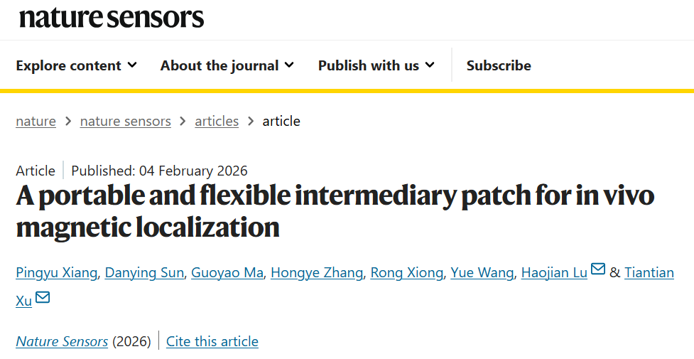 2月4日,中国科学院深圳先进技术研究院徐天添研究员与浙江大学陆豪健研究员团队提出了一种可贴附、可定制的柔性磁定位贴片系统,并在此基础上构建了一种双阶段磁定位框架。该研究以《A Portable and Flexible Intermediary Patch for in vivo Magnetic Localization》为题,发表在知名学术期刊《Nature》(《自然》)旗下专注于传感器研究领域的子刊《Nature Sensors》(《自然·传感器》)上。浙江大学控制学院博士生向平宇,硕士生孙丹颖,中国科学院深圳先进技术研究院博士生马国耀为共同第一作者,徐天添研究员和陆豪健研究员为共同通讯作者。