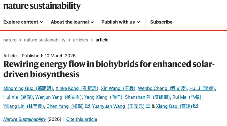 3月10日,中国科学院深圳先进技术研究院定量合成生物学全国重点实验室、合成生物学研究所研究员高翔团队联合南京大学教授王元元团队、上海交通大学教授杨琛团队,在《自然—可持续发展》(Nature Sustainability)上发表最新研究成果。团队成功构建出一种人工光合工程细胞,使非光合工业微生物能够直接利用太阳能,驱动废弃碳源向高附加值化学品高效转化,为非粮碳源生物制造和绿色低碳产业转型提供了新的技术路径。