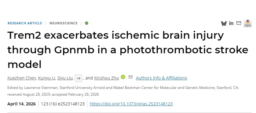 4月14日,中国科学院深圳先进技术研究院脑认知与脑疾病研究所/深港脑科学创新研究院祝心舟团队,联合深圳理工大学生命健康学院Helmut Kettenmann/项贤媛团队在国际期刊PNAS在线发表了一项题为"Trem2 exacerbates ischemic brain injury through Gpnmb in a photothrombotic stroke model"的研究论文。该研究揭示了Trem2在缺血性脑卒中后通过调控小胶质细胞介导神经炎症,进而加剧脑损伤的新机制,为理解卒中病理过程及临床转化提供了重要的新视角。