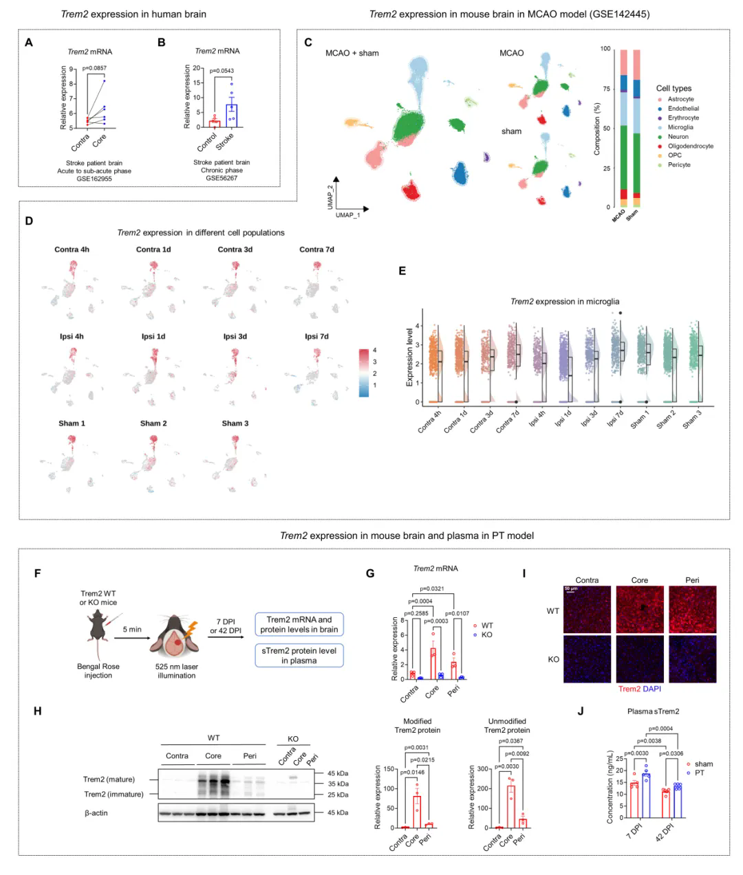 为解释Trem2在卒中动物模型与临床数据之间的矛盾功能,研究团队首先对文献普遍使用的脑中动脉栓塞(MCAO)卒中模型进行了系统评估,发现该模型无法有效模拟人类卒中患者大脑及外周血中Trem2表达显著上调的病理特征。基于MCAO模型获得的实验数据难以支持Trem2具有神经保护作用的结论。鉴于卒中后小胶质细胞介导的神经炎症反应是重要的病理标志,研究团队转而采用能够强烈诱导神经炎症的光化学栓塞(PT)模型。在该模型中,Trem2表达显著上调,与卒中患者的特征高度一致。