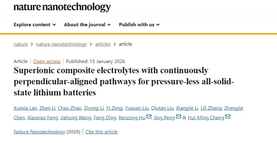Nature Nanotechnology | 深圳先进院成会明院士团队基于垂直连续二维离子通道构建超离子电导柔性固态电解质