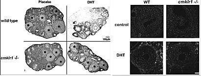 野生型和CMKLR1敲除小鼠在DHT诱导90天后卵巢的表型和卵泡凋亡