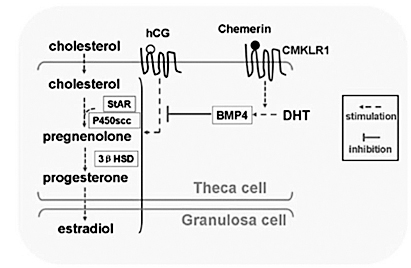 迄今,科研人员已证明chemerin有三个受体发挥生理功能,包括CMKLR1、CCRL2和GPR1。每个受体表达与分布以及介导的功能都不相同。CMKLR1是脂肪因子chemerin的一个受体,在卵巢的颗粒细胞和膜细胞上都有特异性的表达,这两种细胞是体内合成性激素的重要来源。