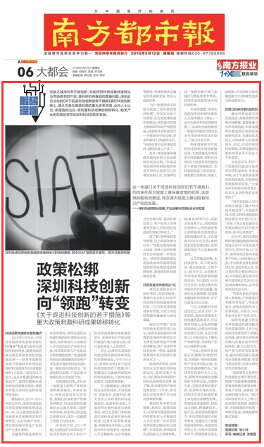 《南方都市报》:政策松绑深圳科技创新向“领跑”转变《关于促进科技创新的若干措施》等重大政策刺激科研成果转移转化