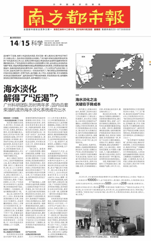 远水解不了近渴,地球上丰富的海水资源,何时又能一解人类淡水之渴?在位于伶仃洋上的桂山岛上,海水淡化示范项目出水现场,广州中国科学院先进技术研究所(简称广州先进所)的工作人员,仅用2分钟左右就让苦涩的海水变成符合国家饮用水水质标准的淡水。广州先进所水科学研究中心张凤鸣博士介绍,这次成功出水的海岛水电联产系统,是国内首套使用废热的低温多效蒸馏海水淡化系统。示范系统的运行数据显示,当柴油发电机发电功率在200-800千瓦时,一个小时可以产出淡水1到2 .5立方米,这些水足够150人到300人一天的淡水需求了。“我们研发出的利用余热进行海水淡化的新技术,可用于海岛、远洋渔船、海上平台、沿海地区等,可大幅降低海水淡化实际能耗和成本”,虽然没有进行严格的成本核算,但张凤鸣预计说,使用废热发电较之目前常规的海水淡化技术,成本降低至少三分之一。