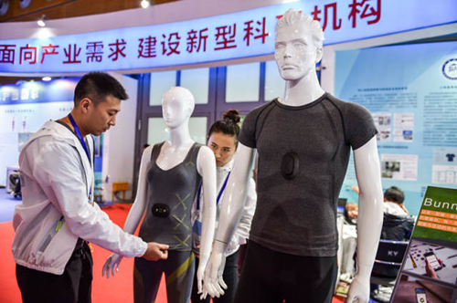 这是11月16日拍摄的阿木新科技公司推出的智能跑步衣。这款衣服将柔性传感技术与衣物相结合,在运动中实时监测心电图,并显示在app上。新华社记者 毛思倩 摄
