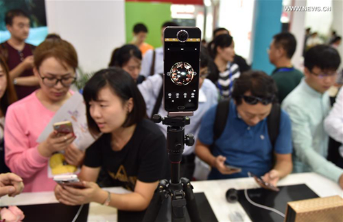 Audience experience a smart phone which can shoot VR photos and videos at the China Hi-Tech Fair in Shenzhen, south China's Guangdong Province, Nov. 17, 2016. (Xinhua/Mao Siqian)