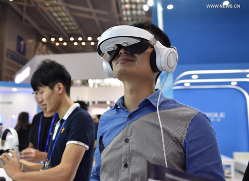 A man experiences a head-wear 3D cinema at the China Hi-Tech Fair in Shenzhen, south China's Guangdong Province, Nov. 17, 2016. (Xinhua/Mao Siqian)