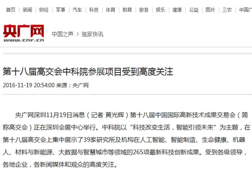 央广网:第十八届高交会中科院参展项目受到高度关注