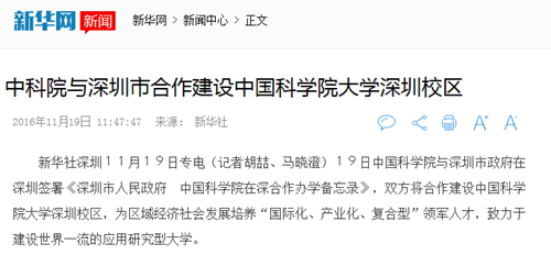 新华网:中科院与深圳市合作建设中国科学院大学深圳校区