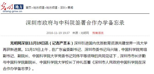 光明网:深圳市政府与中科院签署合作办学备忘录