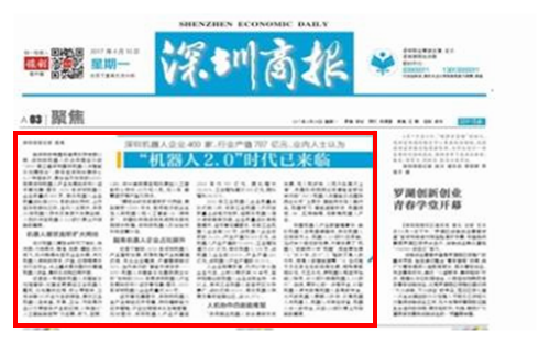 《深圳商报》:深圳机器人企业469家、行业产值787亿元,业内人士认为 “机器人2.0”时代已来临