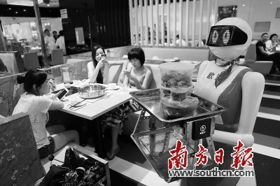 毕亚雷认为,服务机器人需求很大,但要抓住用户痛点。图为深圳一家火锅店内,机器人负责送餐。南方日报记者 朱洪波 摄
