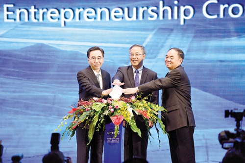 中共中央政治局委员、广东省委书记胡春华,中国工程院院长周济,广东省长朱小丹共同按动由中科创客学院团队用3D打印技术制作的魔方,启动第十七届高交会(羊城晚报记者 王磊 摄)