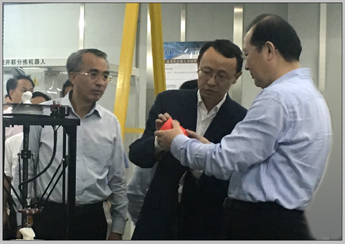 调研期间,任学锋考察了广州先进所机器人与智能装备研究中心,详细了解了双臂协作柔性机器人、基于VR动感座椅、高速并联机器人等项目进展,并了解了所内人才队伍引进及建设情况。任学锋对广州先进所所取得的成绩表示祝贺,赞赏广州先进所扎根南沙及对南沙的科技与经济做出的贡献,并对先进所员工在南沙的生活表达了关怀与关切。