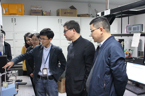 葛均波院士(中)在先进院副院长、医工所所长郑海荣(右一)与医工所生物医学光学与分子影像研究室主任宋亮宋亮(前排左一)等的陪同下了解相关研究工作