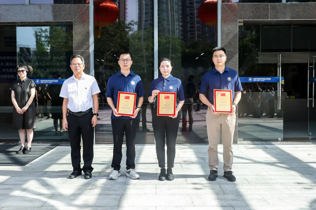 吴创之书记向护旗手颁发了纪念奖牌,以表达对他们的嘉奖和激励。今年的护旗手由获得“大项目、大文章、大转化”的优秀职工代表担任,分别是:医工所研究员赖毓霄、材料所研究员张国平和合成所研究员胡政。