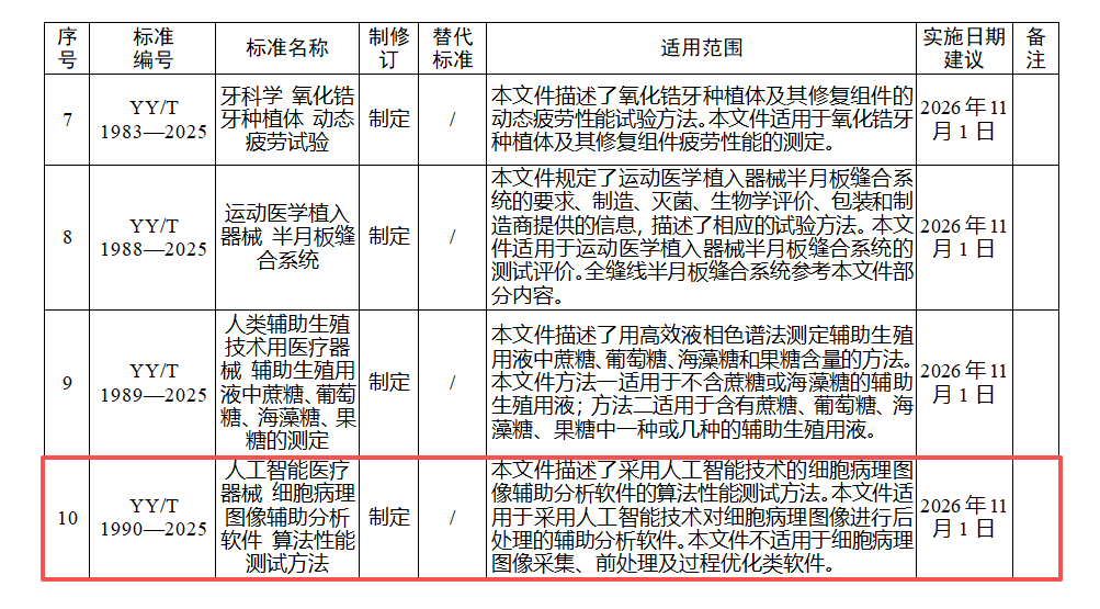 10月30日,中国科学院深圳先进技术研究院医工所医学成像全国重点实验室秦文健研究员主持制定的行业标准YY/T 1990—2025《人工智能医疗器械细胞病理图像辅助分析软件算法性能测试方法》正式发布。