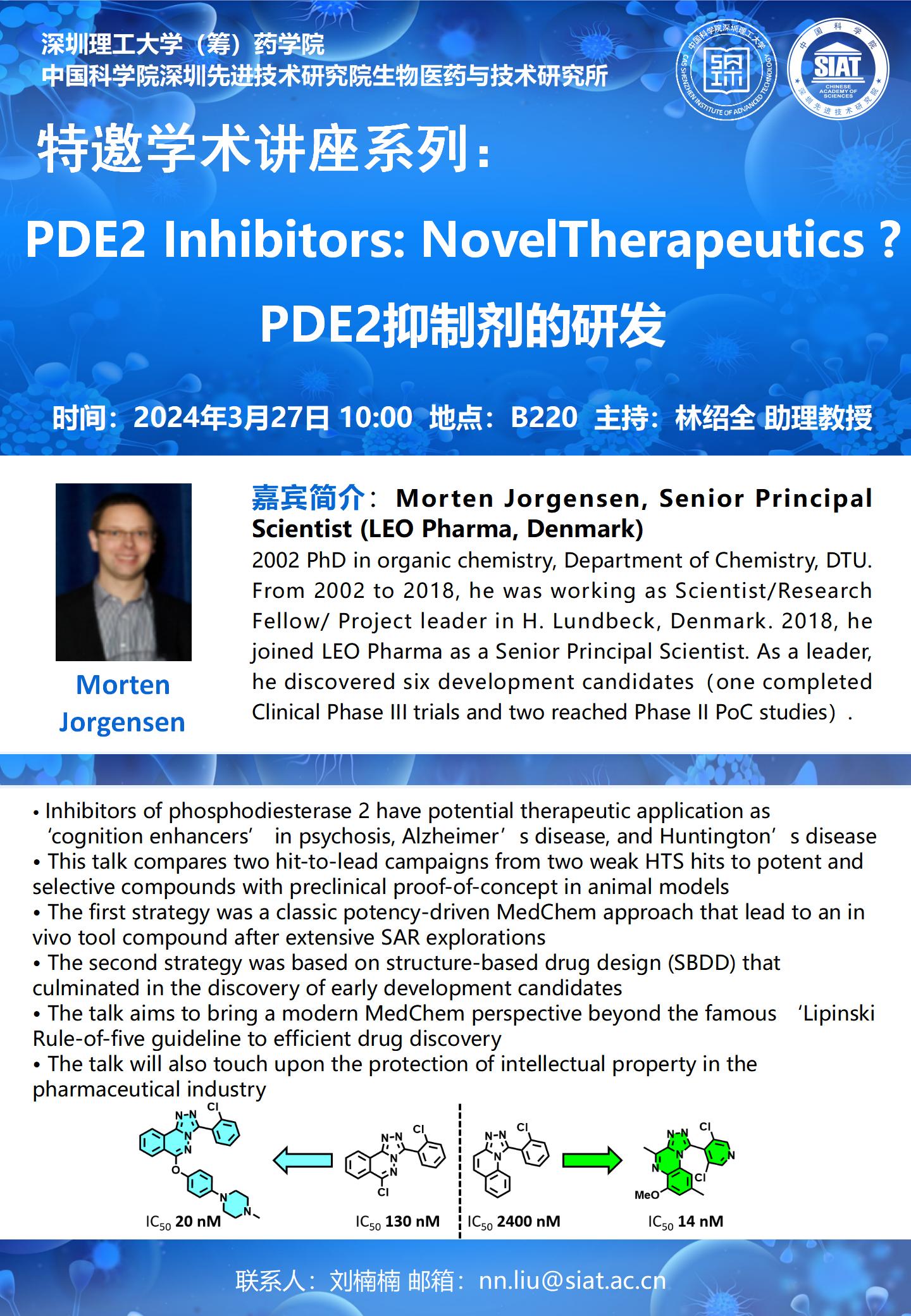 大家好!药学院/医药所“特邀学术讲座”系列将于2024年3月27日(周三)10:00,在先进院B220会议室举行。本次讲座邀请了 Senior Principal Scientist (LEO Pharma, Denmark) Morten Jorgensen 教授带来中文题为“PDE2抑制剂的研发”/英文题为“PDE2 Inhibitors: NovelTherapeutics?”的报告。届时,林绍全 助理教授将主持讲座。