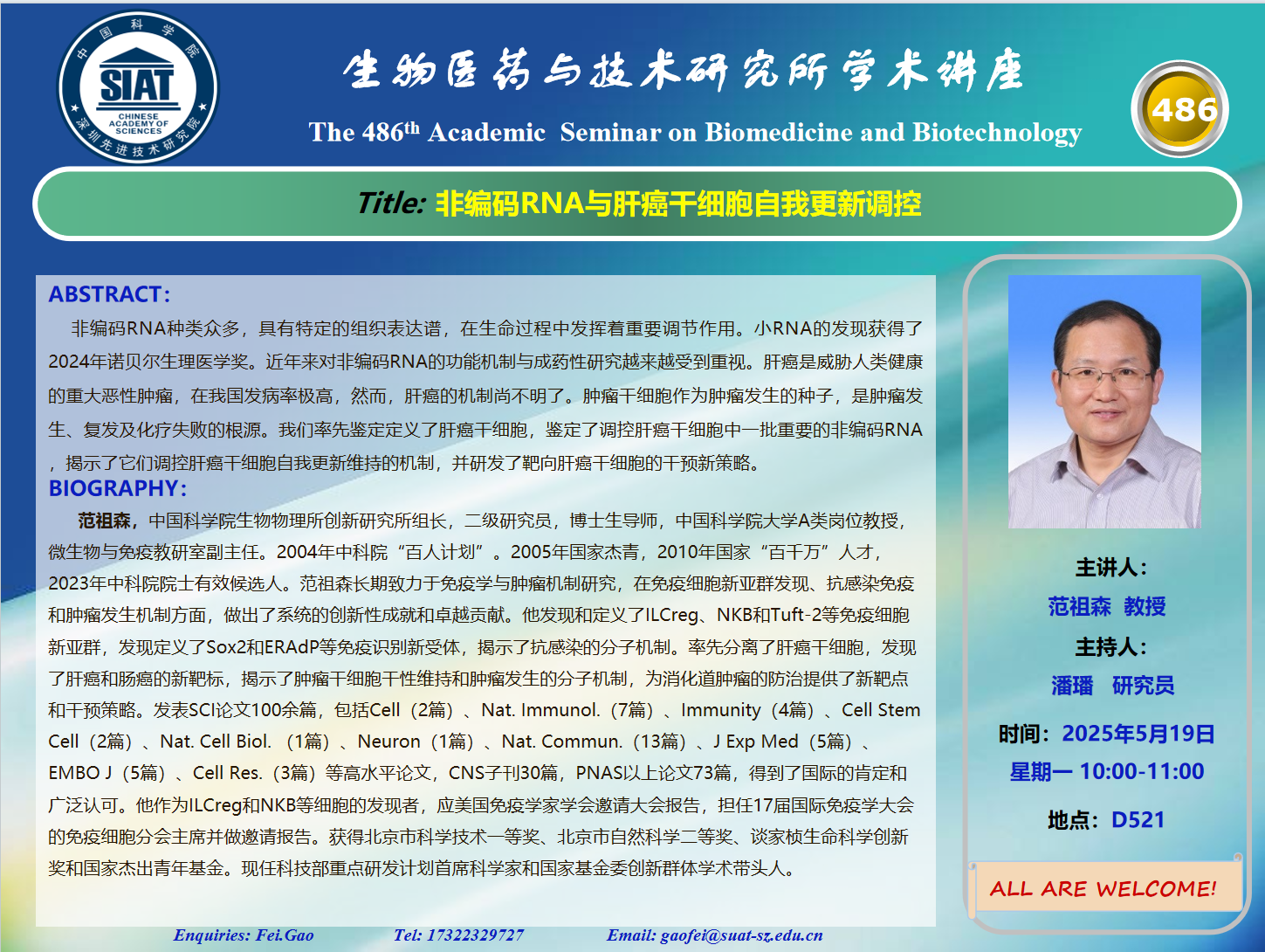 大家好! 医药所第486期学术讲座将于2025年5月19日 星期一 10:00-11:00 D521会议室举行。本次讲座邀请了来自中国科学院生物物理所 范祖森 教授带来“非编码RNA与肝癌干细胞自我更新调控”的报告。届时,潘璠 研究员将主持讲座。