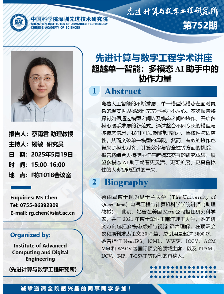 大家好!数字所/计算机学院第752期学术讲座将于5月19日15:00-16:00在F1018会议室举行,本次讲座将邀请昆士兰大学(The University of Queensland) 蔡雨君 助理教授作题为“超越单一智能:多模态 AI 助手中的协作力量”的报告。