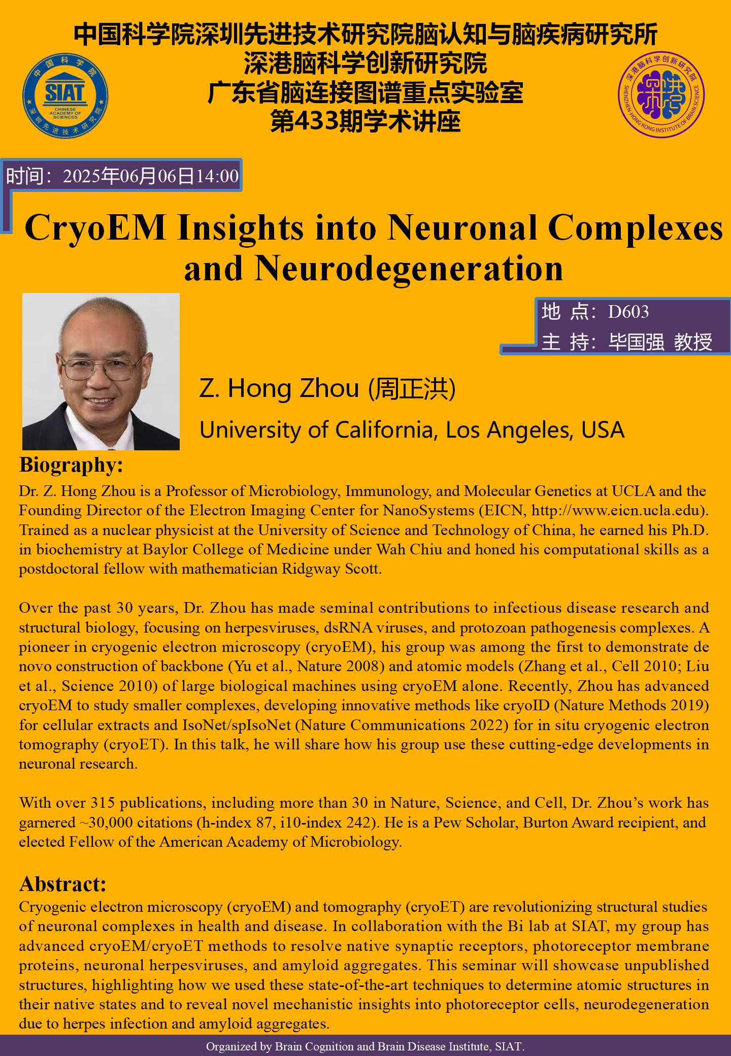 大家好!脑所/深港脑院将于6月6日(星期五) 14:00,地点:D603会议室 举办第433期学术讲座。本次讲座邀请到加州大学洛杉矶分校 周正洪教授,带来题为“CryoEM Insights into Neuronal Complexes and Neurodegeneration”的报告。
