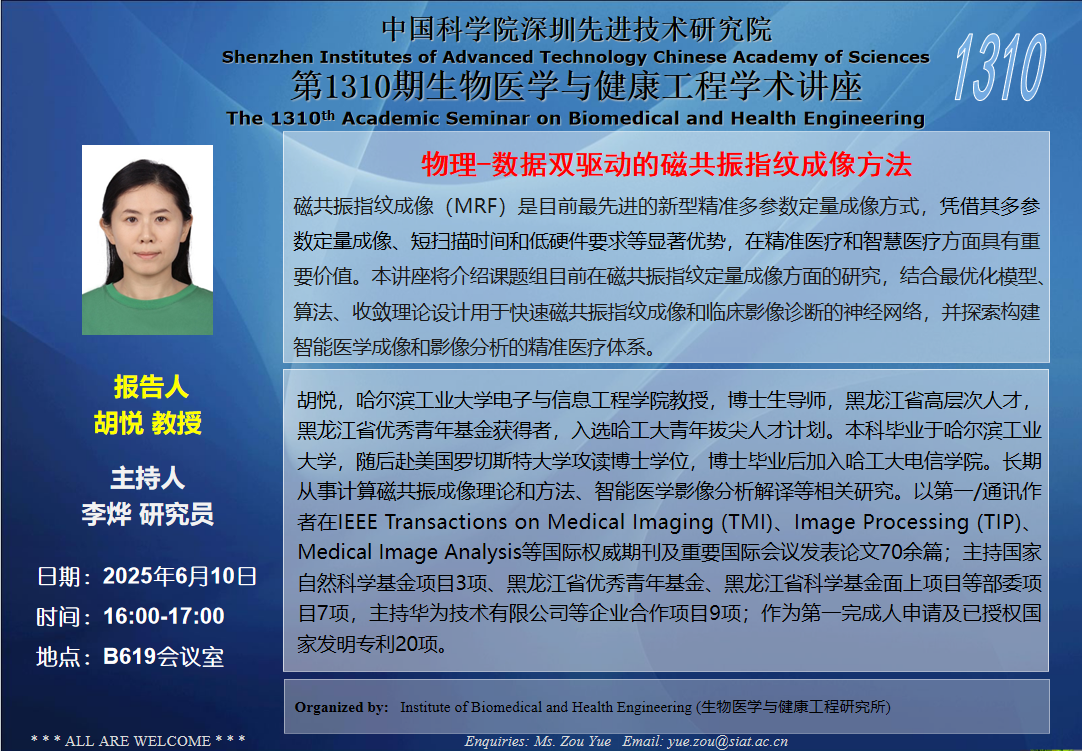 本次讲座邀请了哈尔滨工业大学电子与信息工程学院教授胡悦 教授带来题为物理-数据双驱动的磁共振指纹成像方法的报告